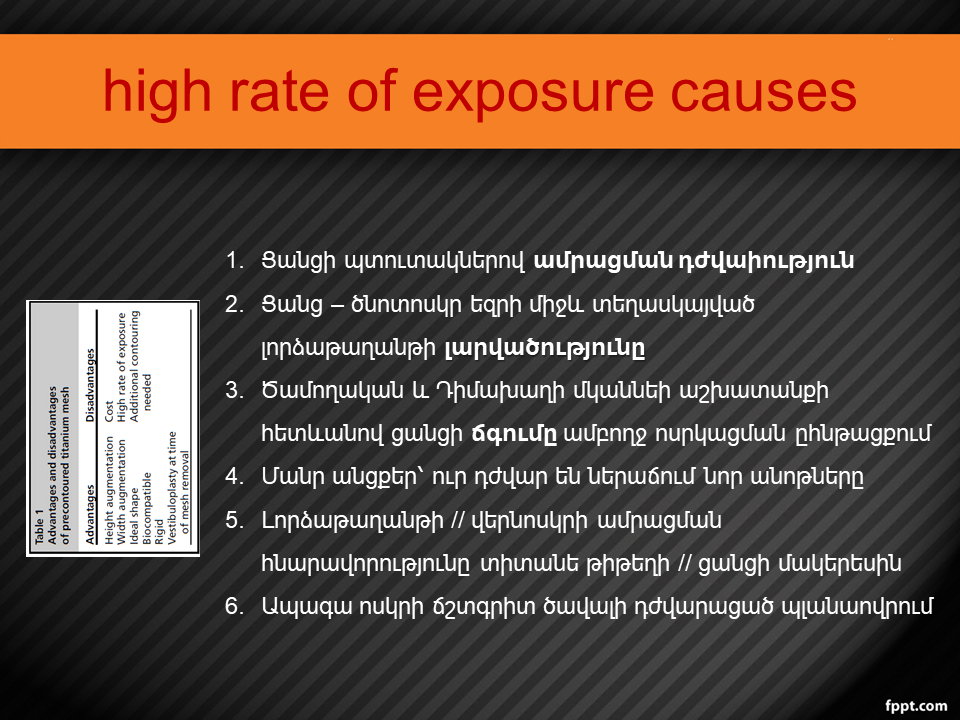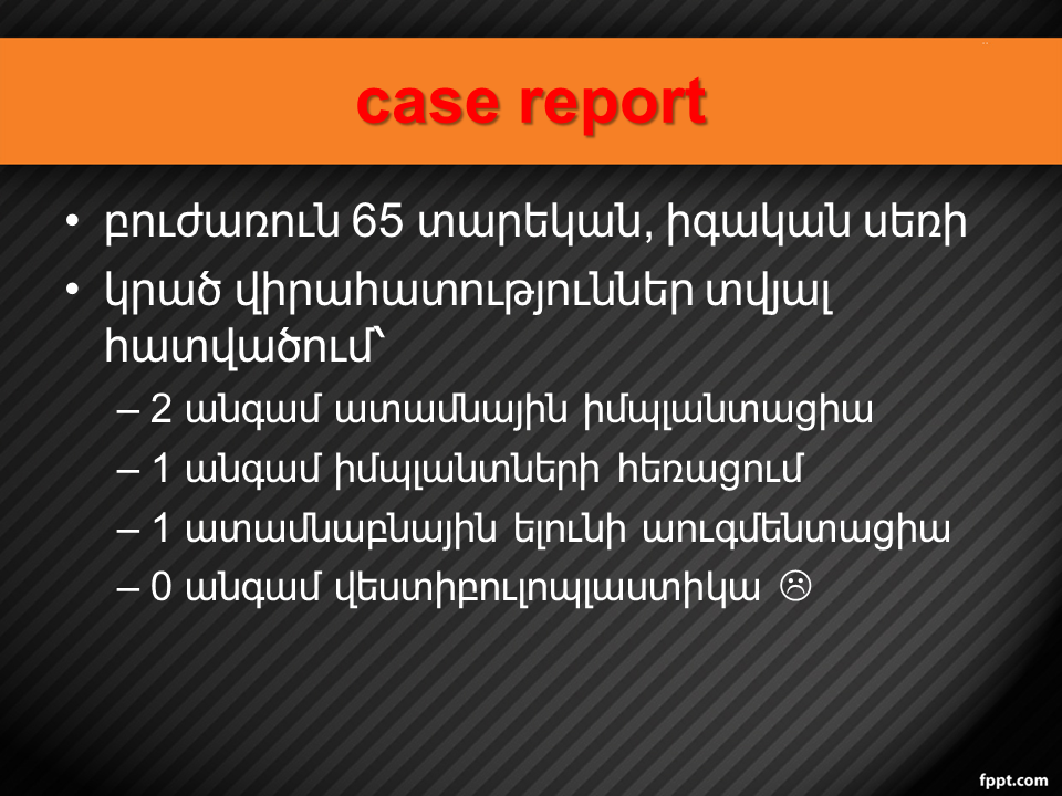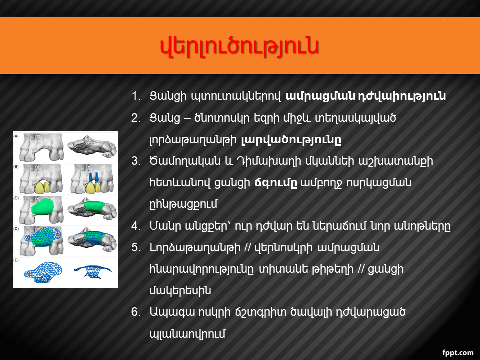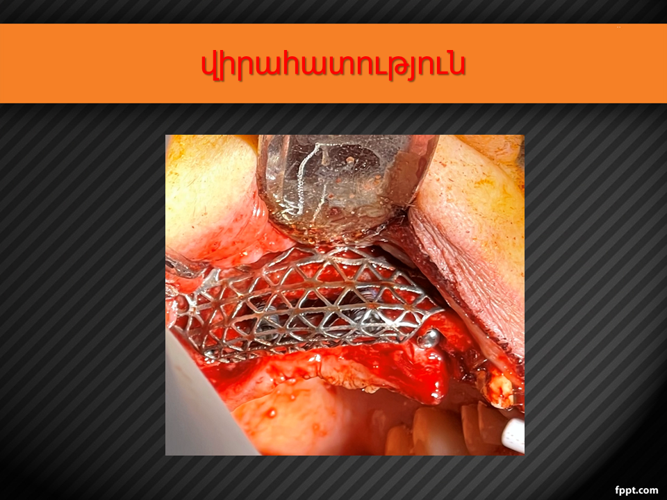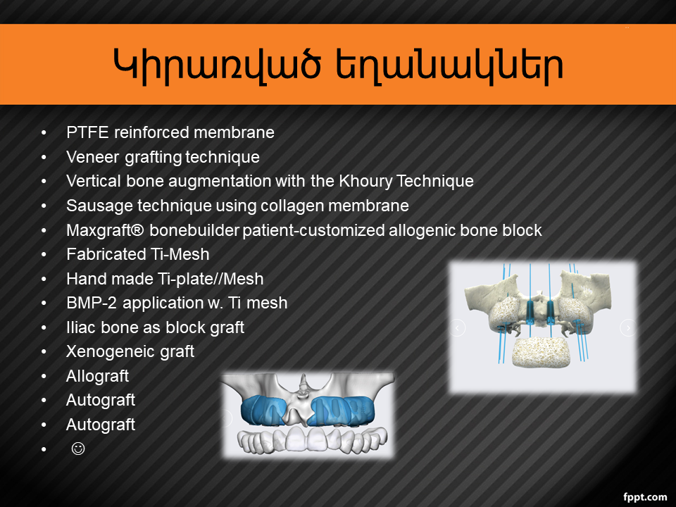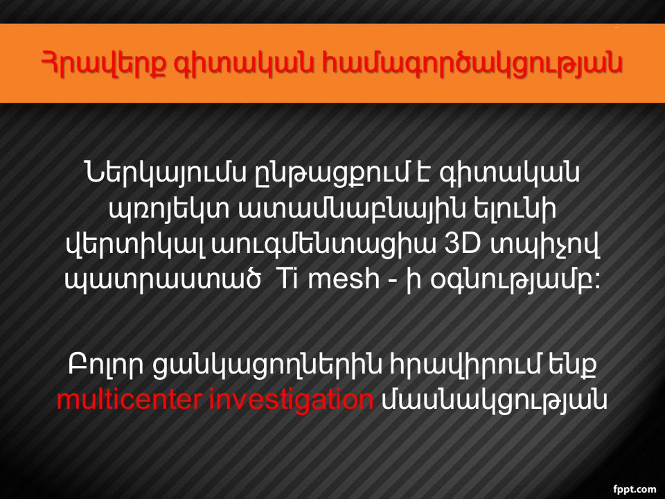 Case report on vertical bone augmentation using a customized 3D-printed titanium mesh in a complex clinical scenario with prior implant failures. Includes surgical planning, techniques, complications, and an invitation for multicenter research collaboration. Presented by Dr. Levon Galstyan at AAOMFS.