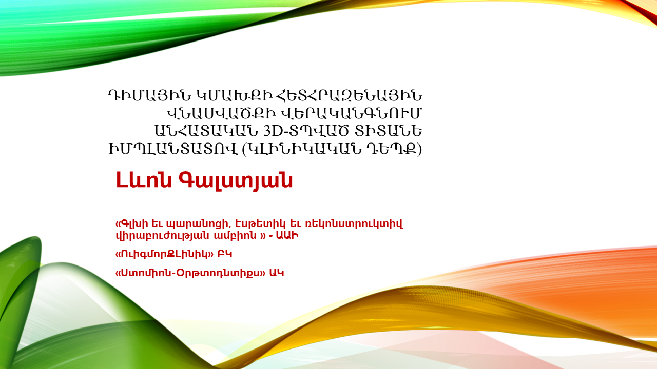 - Nose reshaping (Rhinoplasty) - Periorbital Rejuvenation (Blepharoplasty) - Periorbital rejuvenatin (Brow lift) - Ottoplasty - Cheiloplasty (Paris, Bullhorn Lip Lift, etc.)- Immediate dental implants - Digital Implant Dentistry - Implant fixed removable dentures - Implant fixed non removable dentures