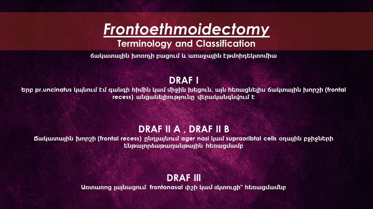 Surgical techniques and classification systems for frontal sinus endoscopic surgery (DRAF I–III), including anatomical landmarks, indications, complications, and case experience. Presented by Dr. Levon Galstyan as part of the FESS Club EVN community.